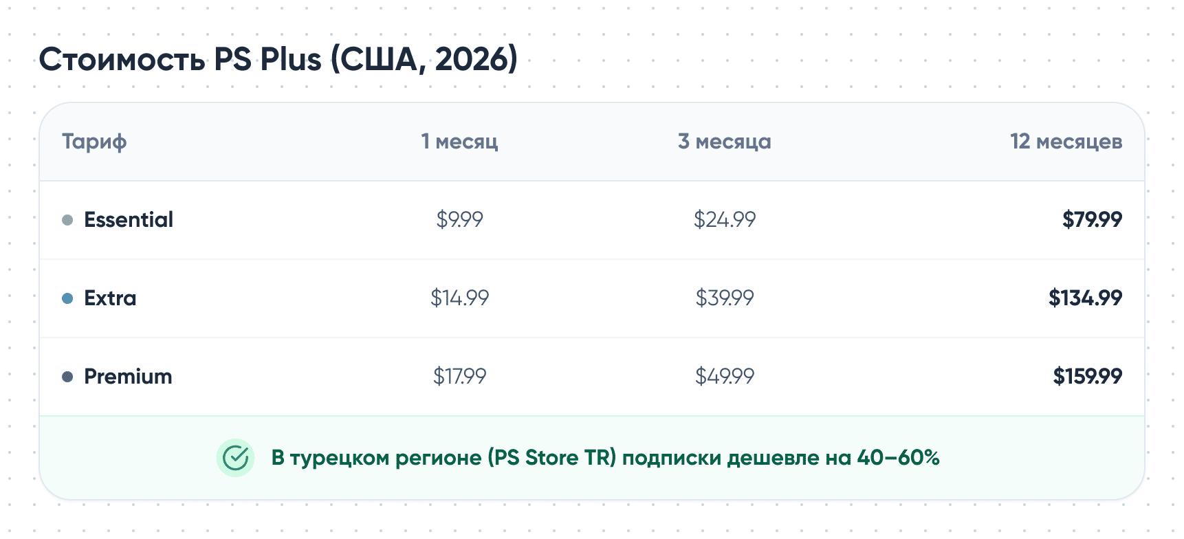 Годовая PS Plus Extra в Турции обходится в 2–3 раза дешевле, чем в США или Европе. Это главная причина, почему большинство россиян в 2026 году используют именно турецкий аккаунт.