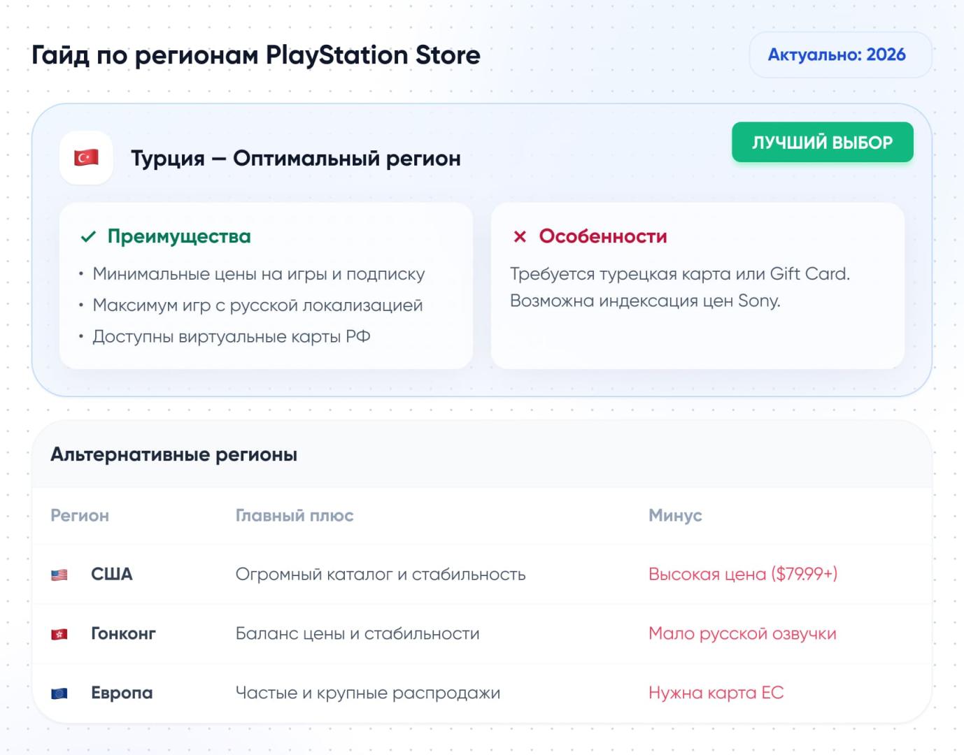 Турция — самый выгодный стабильный регион: низкие цены на PS Plus и игры, русская локализация. США — если для вас важны каталог и стабильность региона, а не минимальная цена. Гонконг — менее популярная альтернатива США.