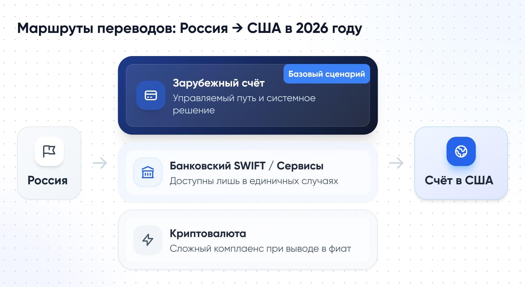 - Если нужен надёжный и понятный по логике маршрут → зарубежный счёт.