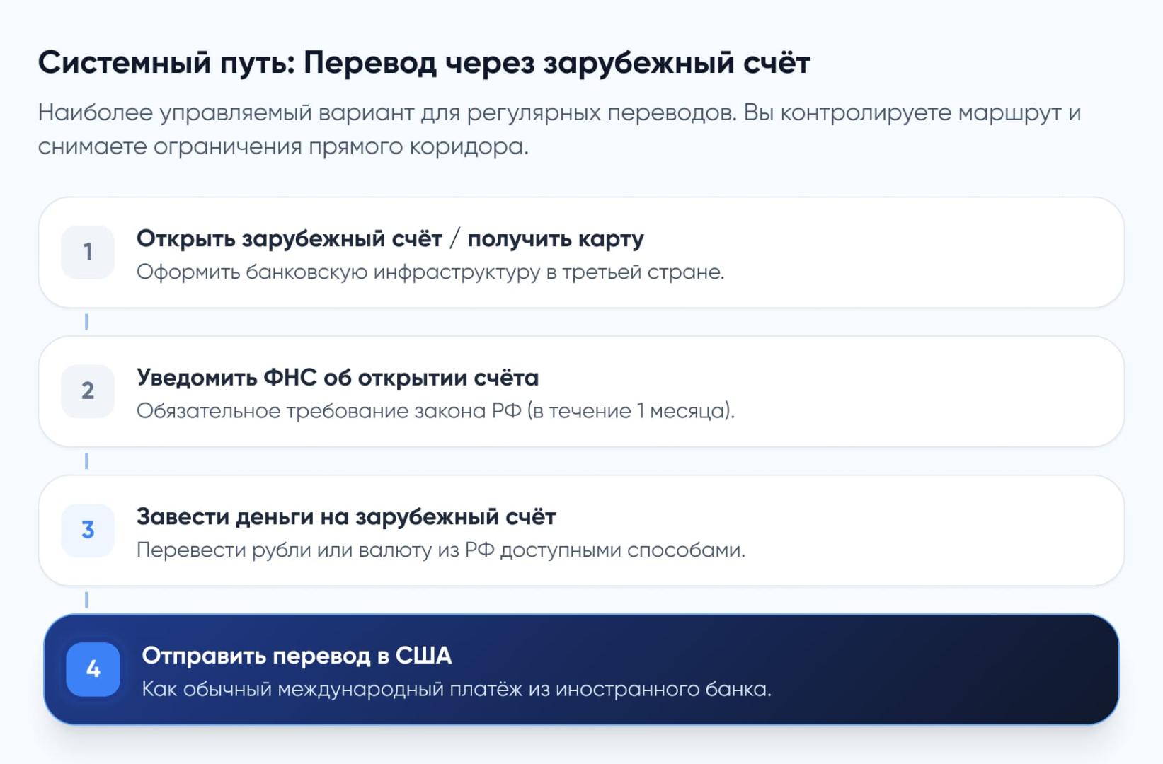 - Вторая часть перевода идёт не из российского банка, а из банка третьей страны — это снимает большинство ограничений прямого коридора.