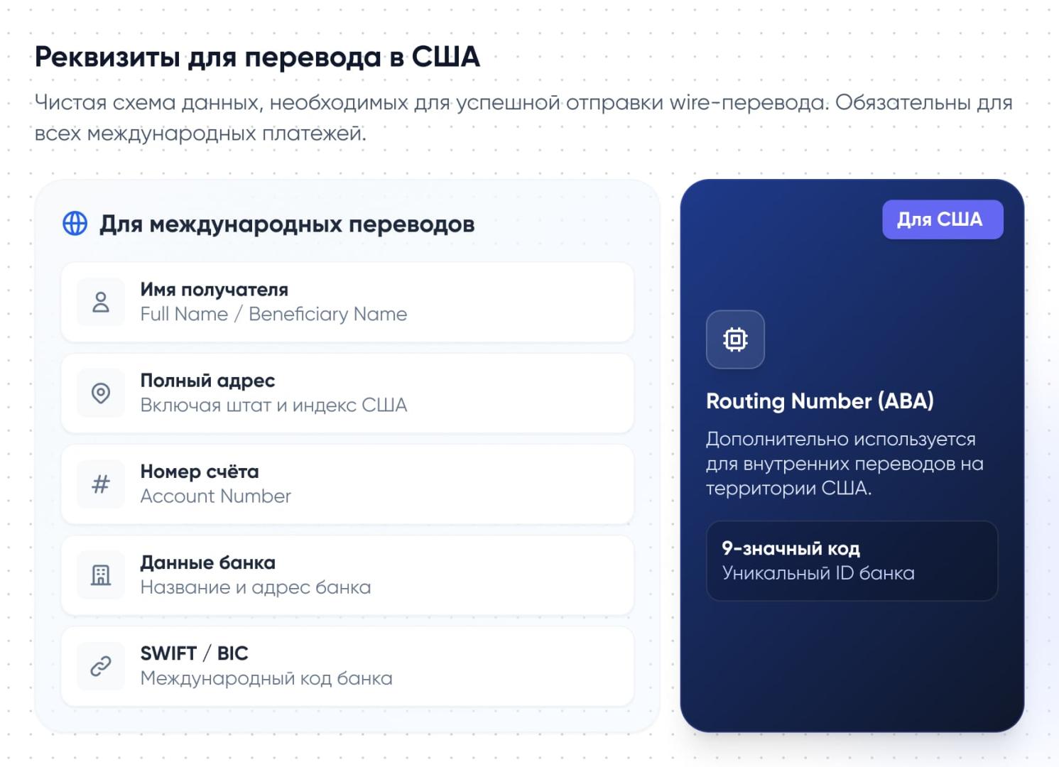 Для внутренних переводов в США дополнительно используется данные routing (ABA) — 9-значный код американского банка.