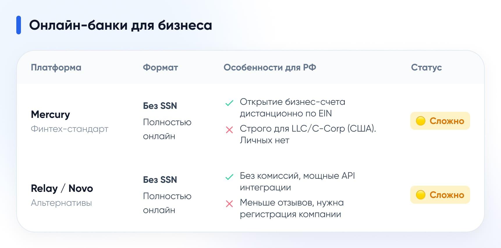 | Relay / Novo | Онлайн (бизнес) | Средняя | 🟡 | $0 | EIN компании |