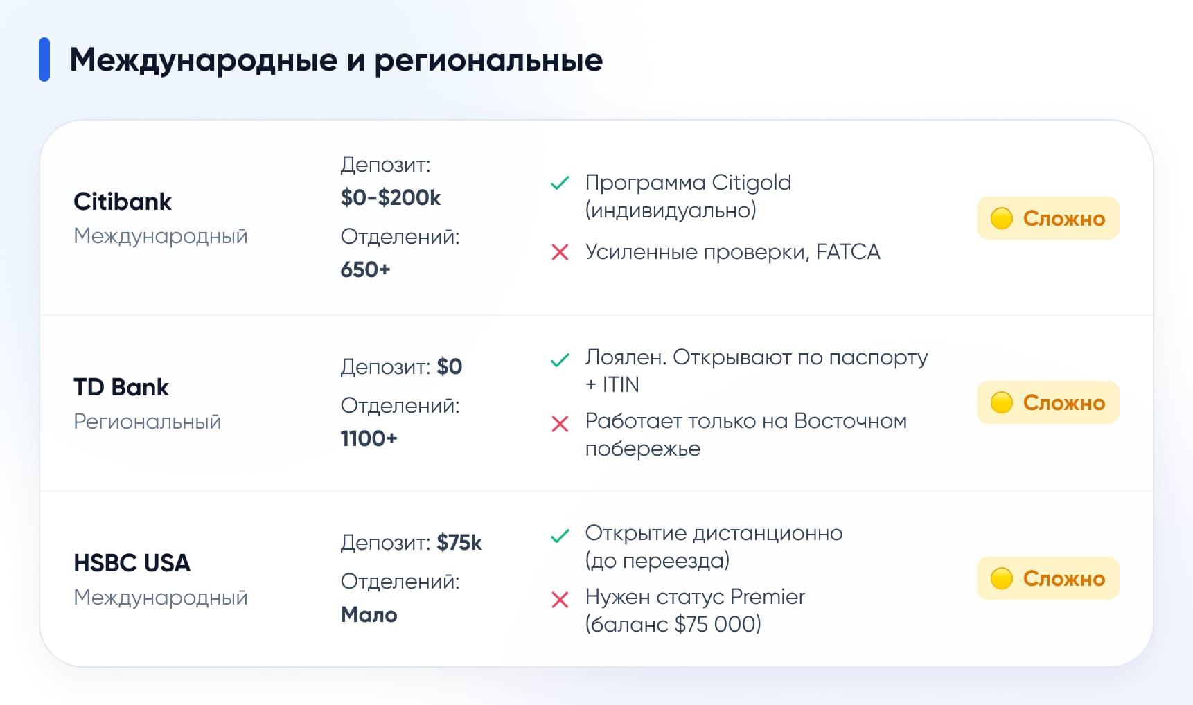 Ни один банк США не имеет «низкой» (🟢) сложности для граждан РФ. Даже самые лояльные варианты требуют ITIN, американскую LLC или значительный депозит.